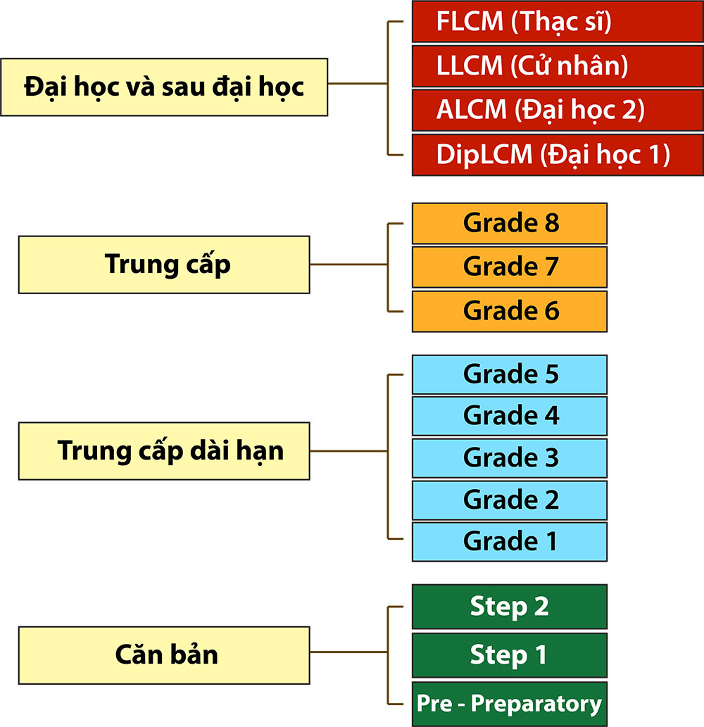 - Các khóa chuẩn bị thi lấy các bằng đại học DipLCM (Diploma), ALCM (Associate), LLCM (Licenciate – Cử nhân), FLCM (Fellowship – Thạc sĩ)